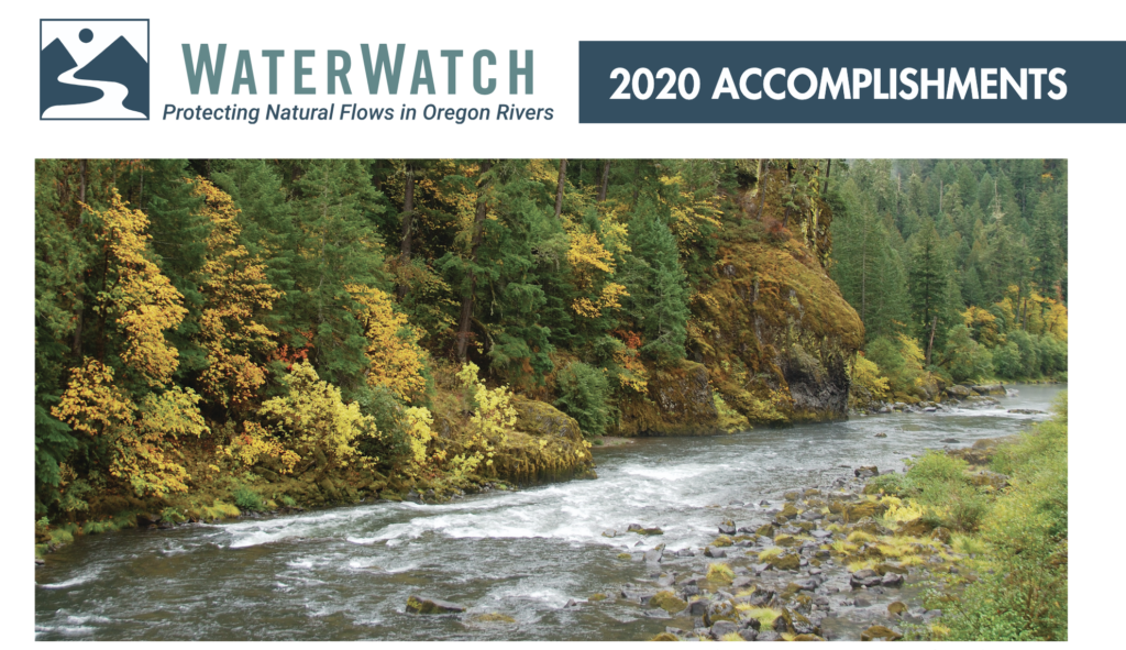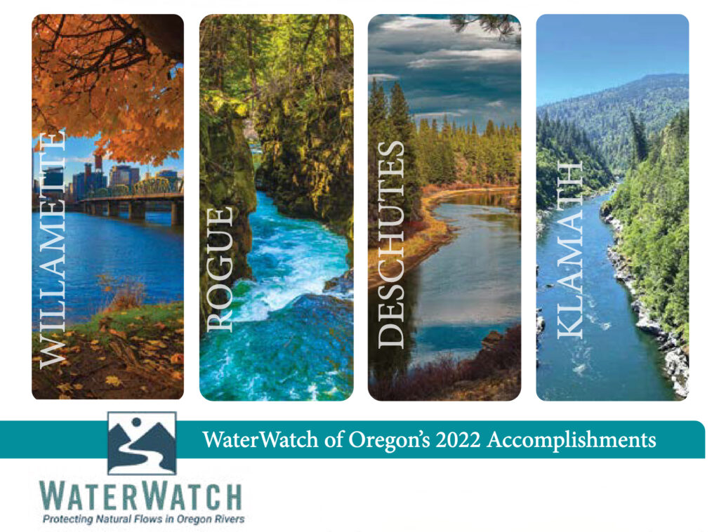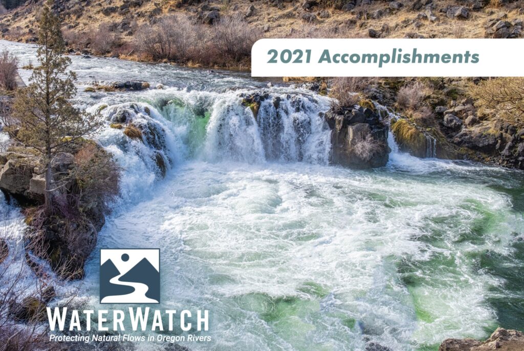 Removal of four lower Klamath River dams greenlighted, victory in Warm Springs Hydro case, Rock Creek hydroelectric water right to instream right transfer, groundwater policy reform; wintertime diversion stopped on Upper Deschutes, open pit mine threat at Grave Creek, Clackamas River defense, Burnt River, Willamette River thermal trading, Harney Basin, Lake Abert.